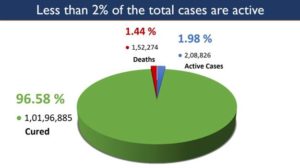 For the first time, India’s share of active cases within the total positive cases has shrunk below 2% (1.98%), the Health and Family Welfare Ministry said on Sunday.