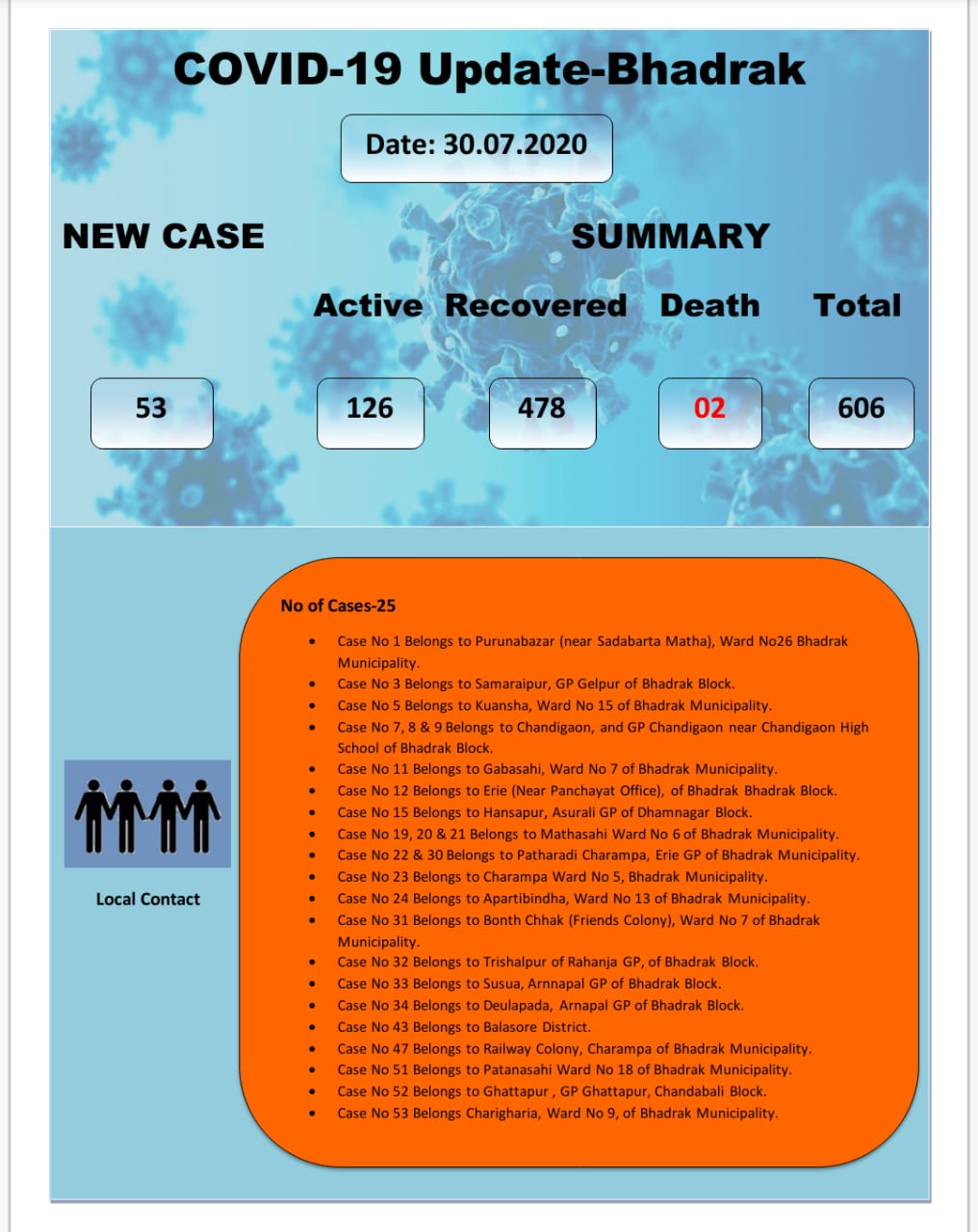Among the local contact cases, 14 are from Bhadrak municipality, 13 from Bhadrak block, three from Dhamnagar block, two from Chandbali block, one each from Bhandaripokhari and Tihidi blocks and one is a returnee from Balasore district.