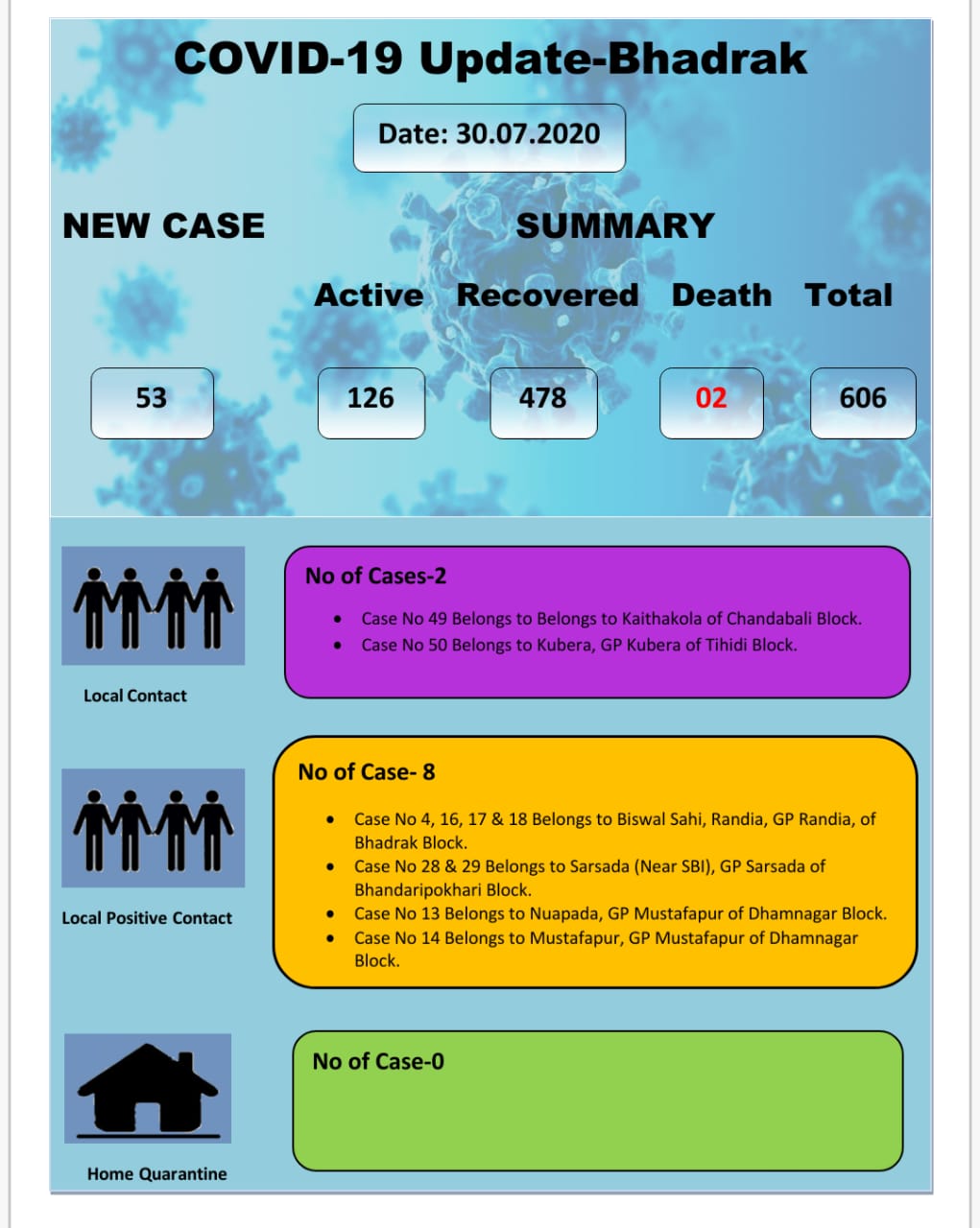 Among the local contact cases, 14 are from Bhadrak municipality, 13 from Bhadrak block, three from Dhamnagar block, two from Chandbali block, one each from Bhandaripokhari and Tihidi blocks and one is a returnee from Balasore district.