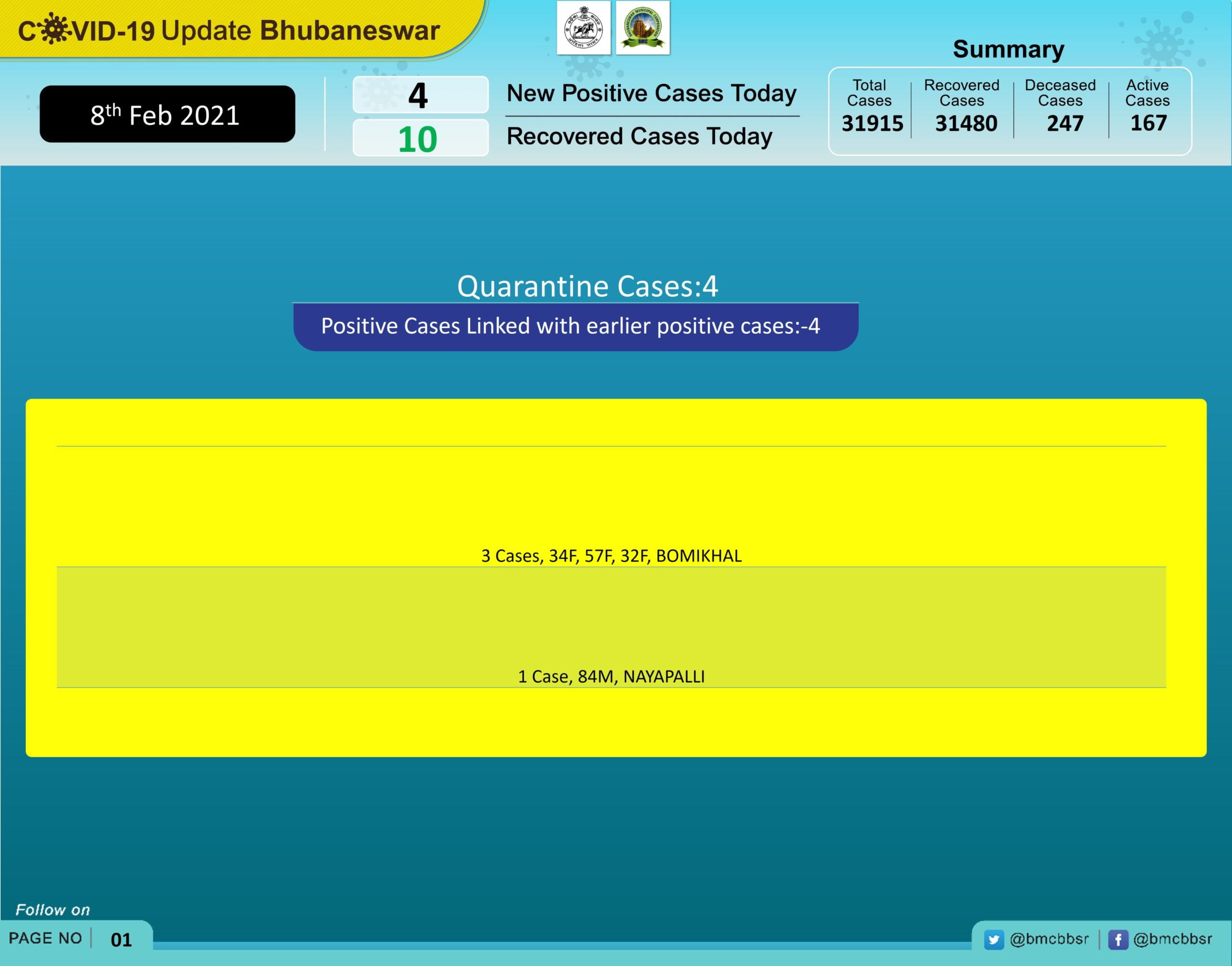 Of the new cases, all four persons are from the quarantine center. Of them, three are from Bomikhal and one from Nayapalli.