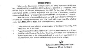 Sambalpur: Sambalpur University, Jyoti Vihar, Burla will remain closed from July 22 to 31. The decision was taken in larger public interest to contain the spread of COVID-19, said the district collector via an order.