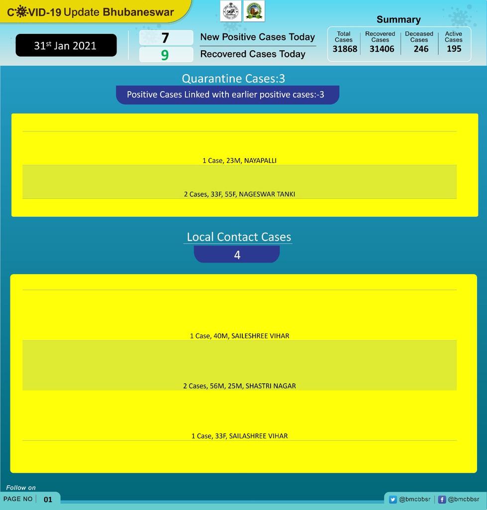 A total of 31,868 people have been infected by the novel coronavirus in Bhubaneswar so far, of which 31,406 have recovered. While 246 have succumbed to the disease, there are 195 active cases at present.