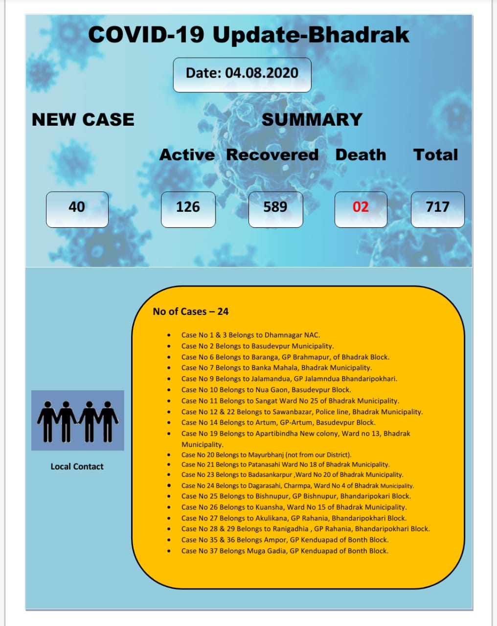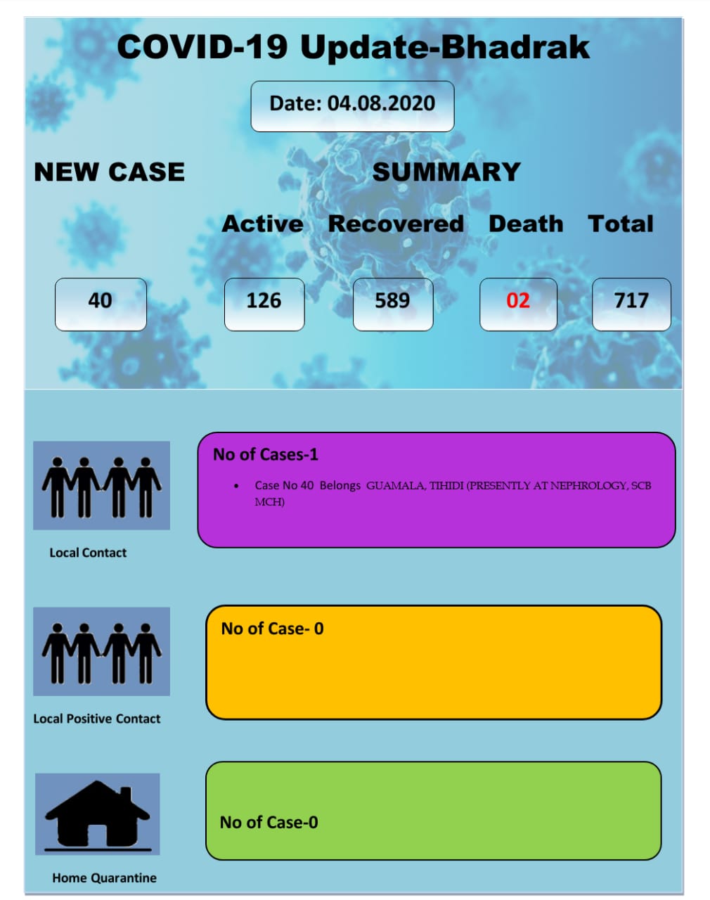 Bhadrak: The COVID-19 tally in Bhadrak district surged to 717 on Tuesday with an overnight addition of 40 cases.