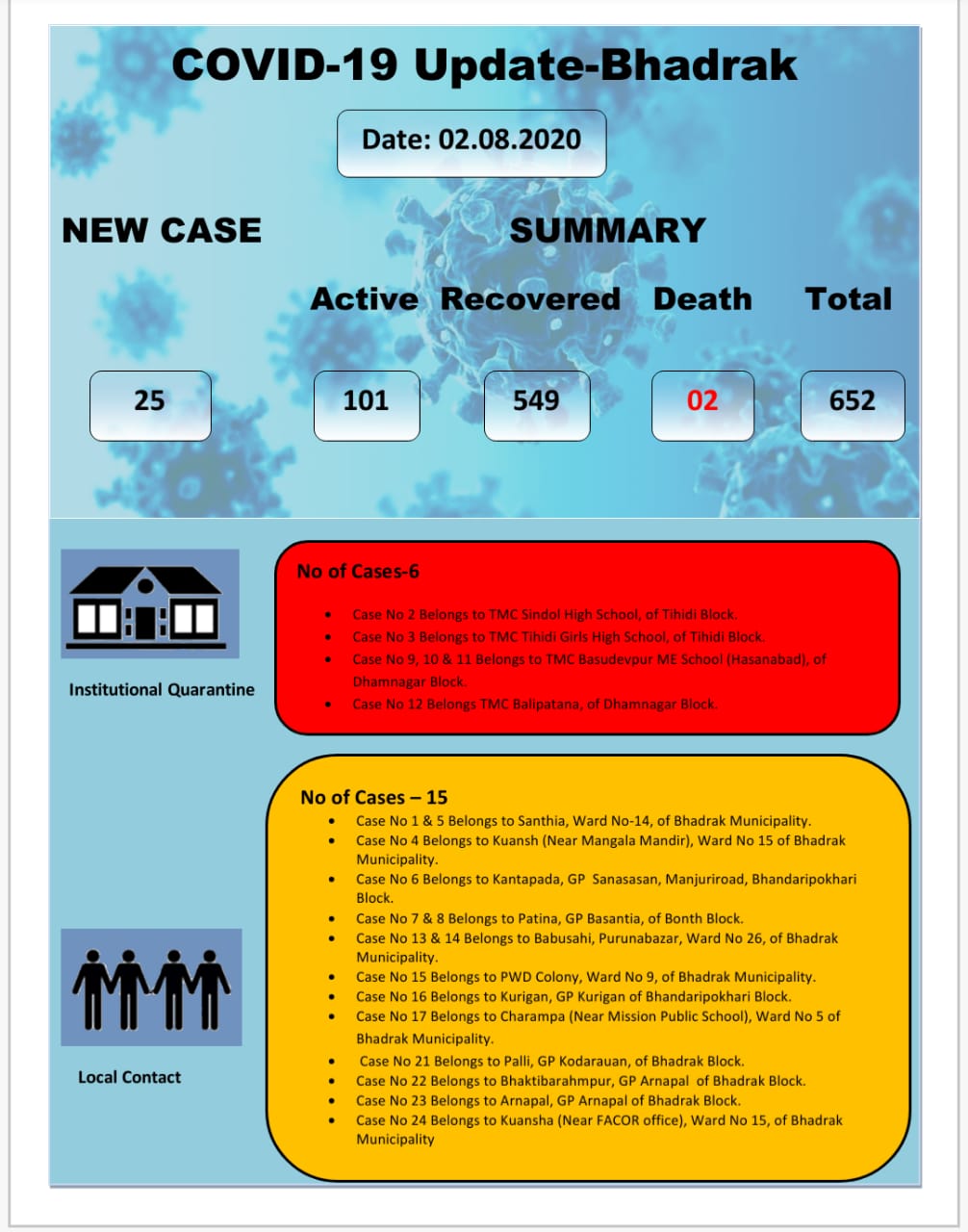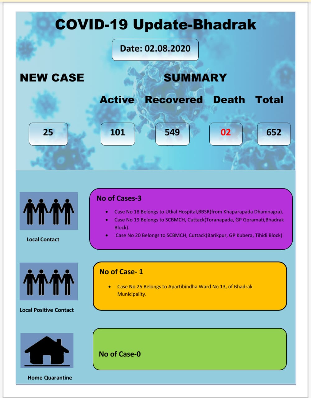 Majority of the local contact cases belong to Bhadrak Municipality while three are under treatment at Utkal Hospital in Bhubaneswar and SCB Medical College and Hospital in Cuttack.