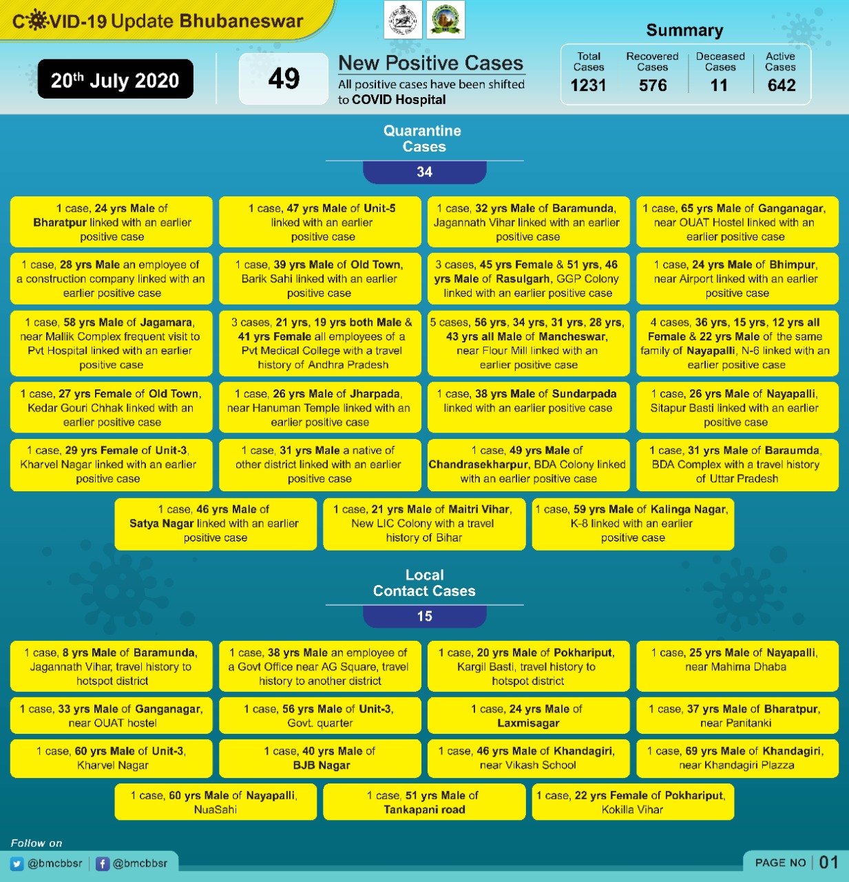 The 14 local contact cases have been reported from Baramunda, Ganganagar, Kharavela Nagar, AG Square area, Unit-3, BJB Nagar, Pokhariput, Nayapalli, Tankapani Road, Khandagiri and Laxmisagar.