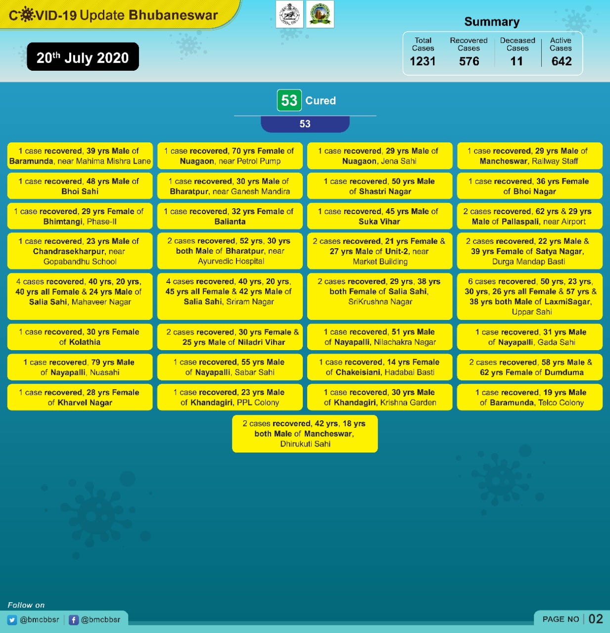 With 11 deaths and 576 recoveries, Bhubaneswar now has 642 active cases.