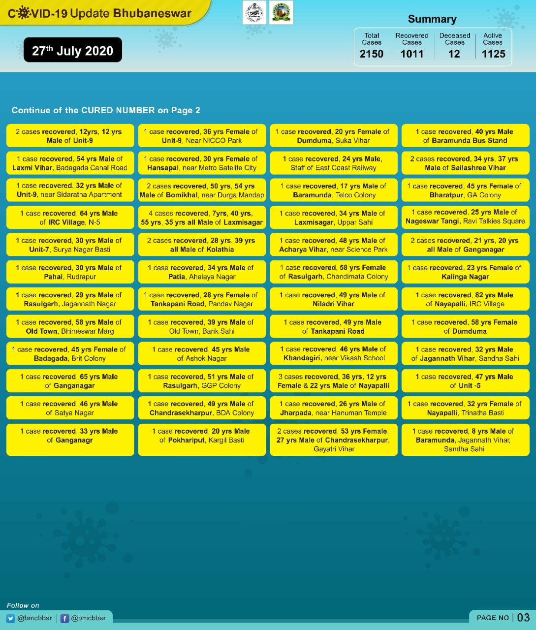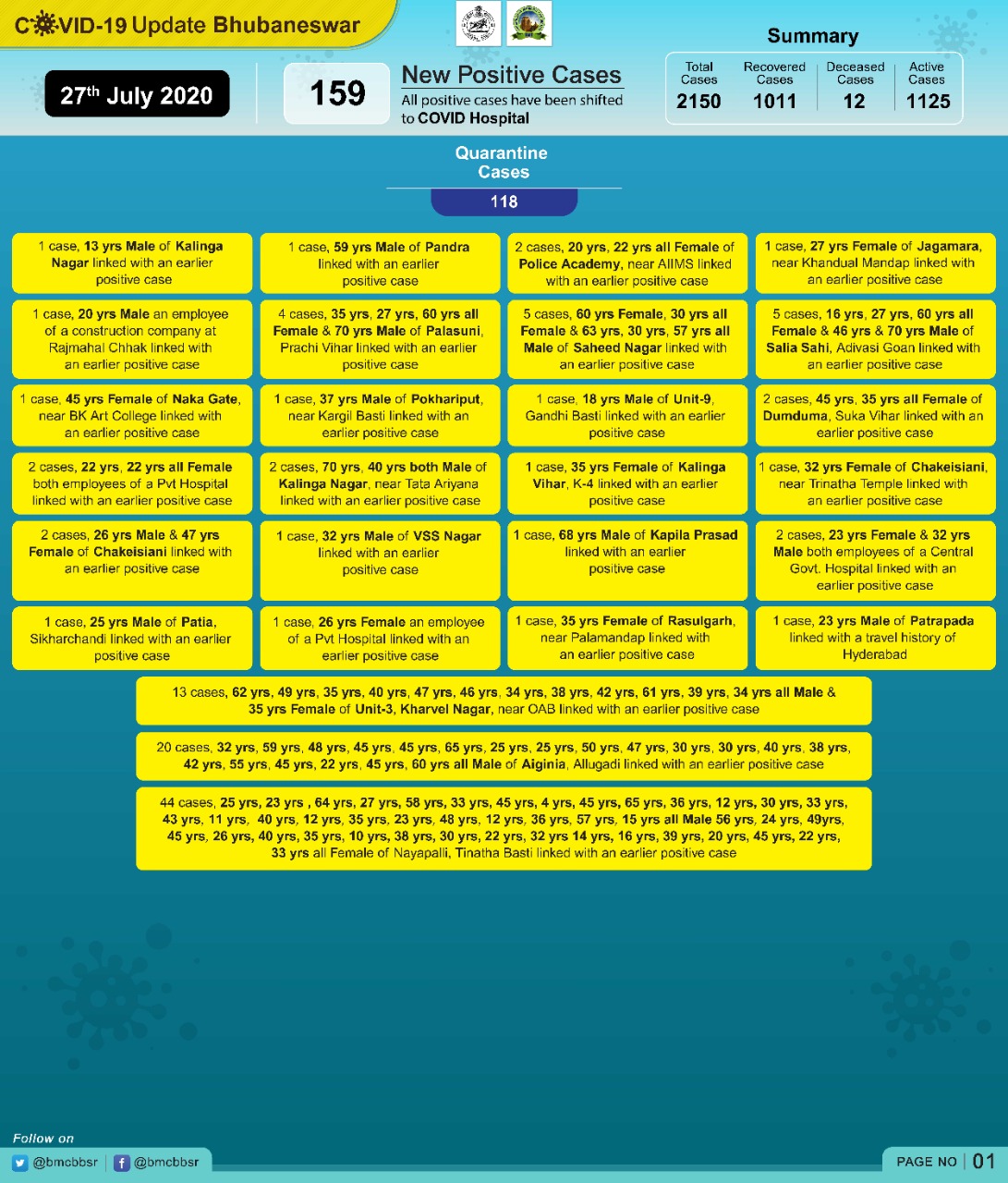 Bhubaneswar: The Odisha capital reported 159 new COVID-19 cases and a record 102 recoveries in the last 24 hours, which took the total to 2150 and 1011 respectively.