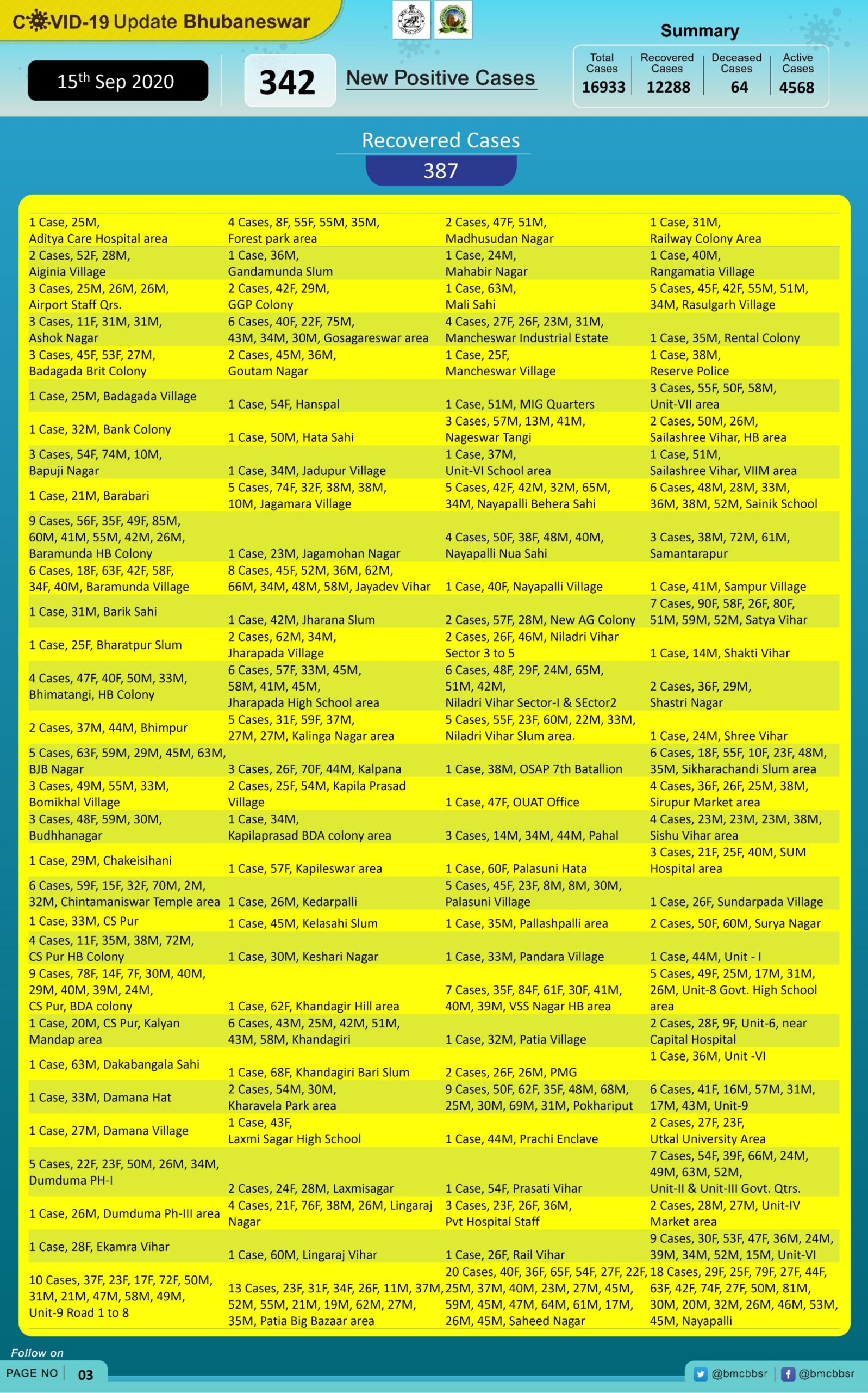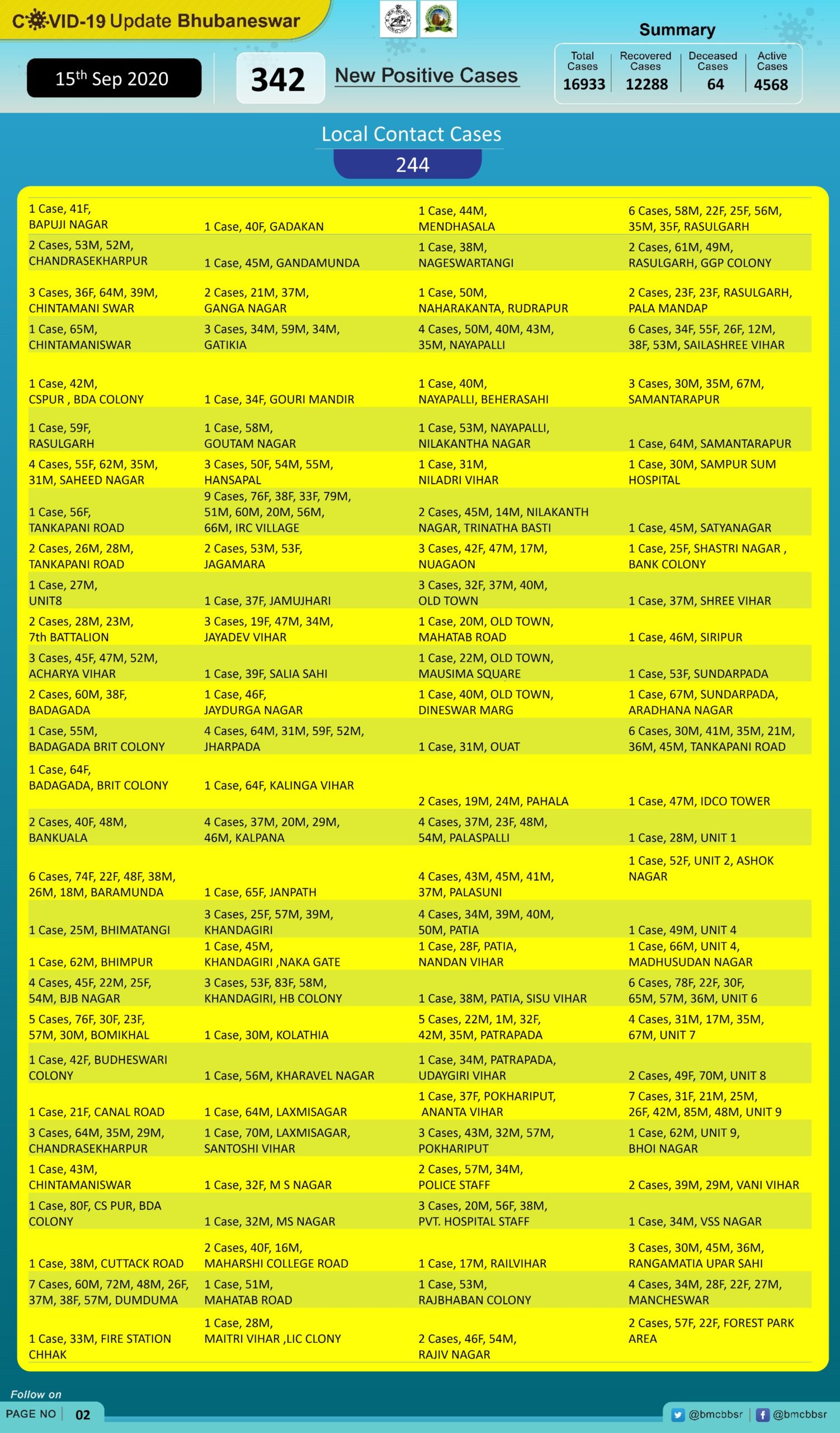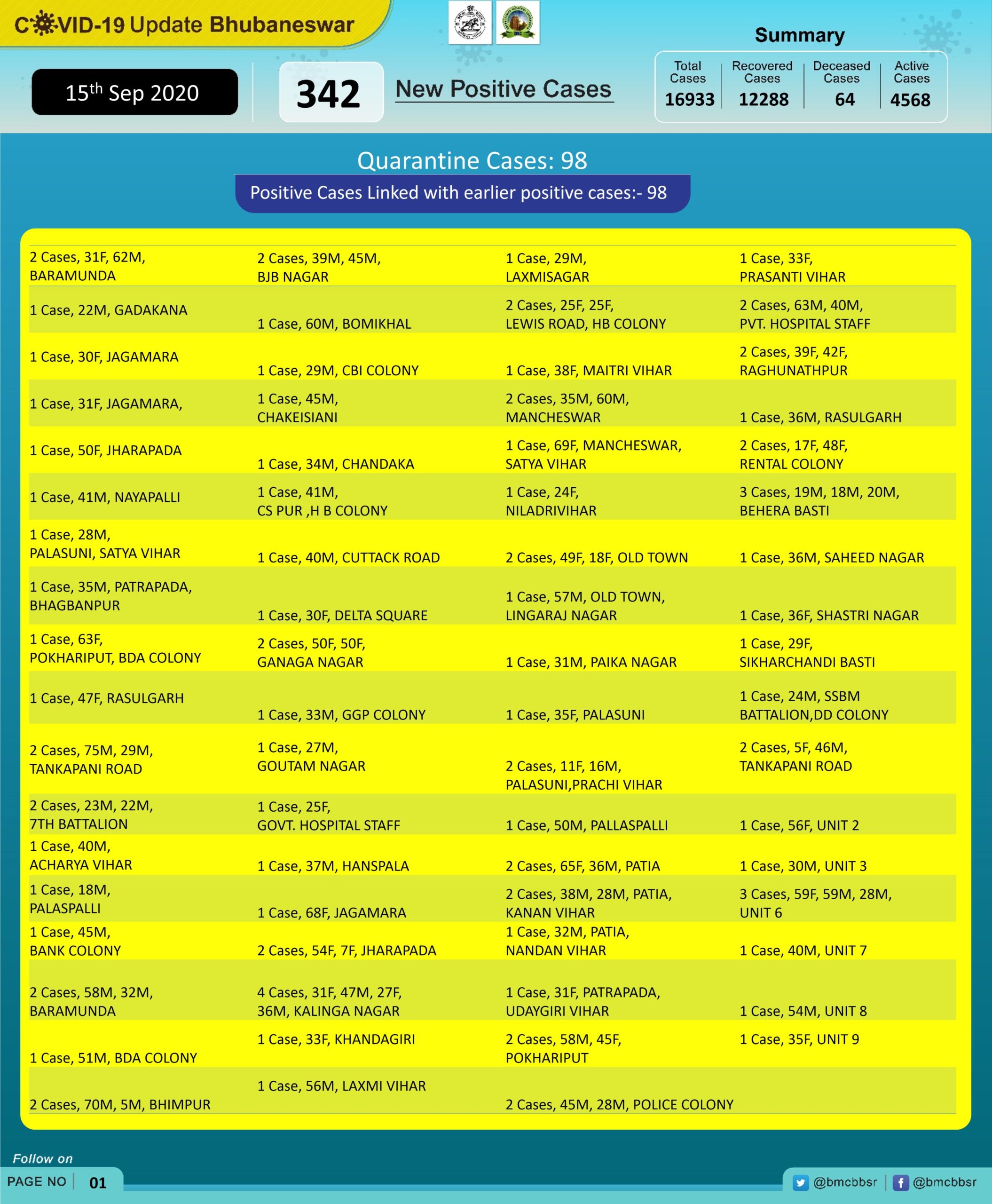 With 64 deaths and 12288 recoveries, Bhubaneswar now has 4568 active cases.