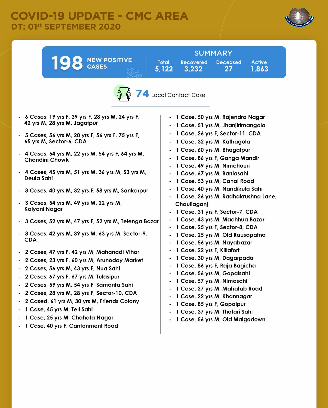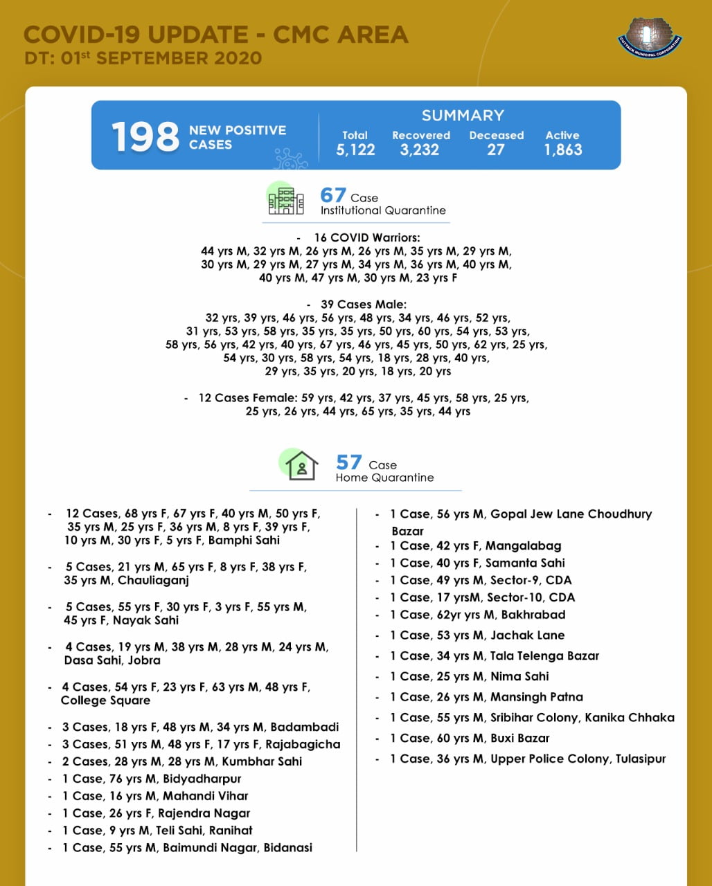 With 27 deaths and 3232 recoveries, Cuttack city now has 1863 active cases.