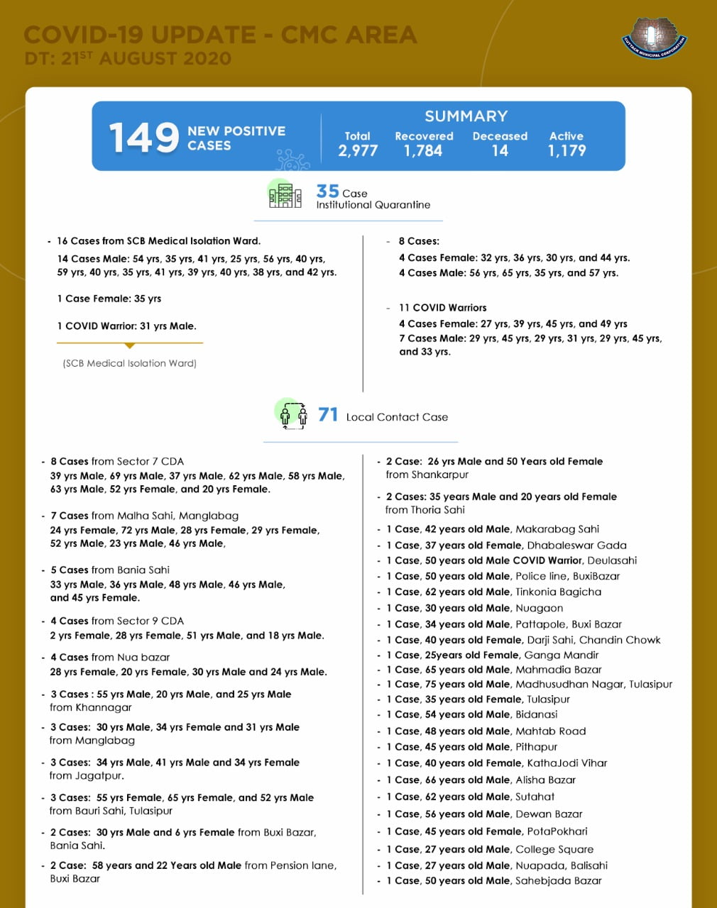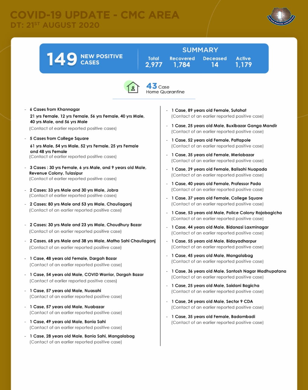 According to the Cuttack Municipal Corporation (CMC), 71 are local contact cases while 43 have been detected from home quarantine and 35 from institutional quarantine.