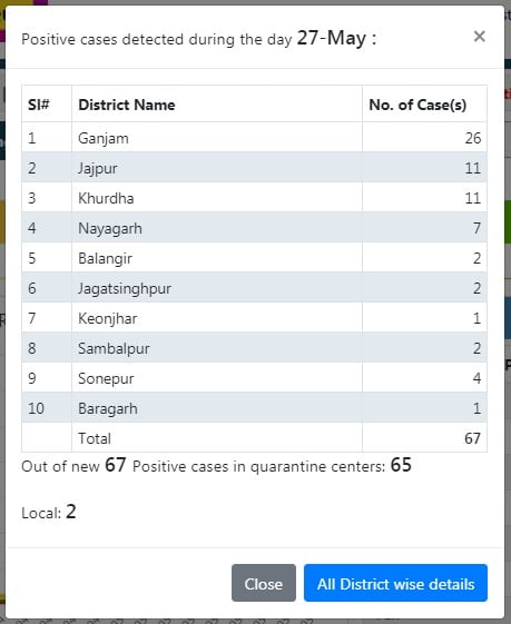 Ganjam reported the highest 26 new cases followed by Jajpur (11), Khuda (11), Nayagarh (7), Balangir (2), Jagatsinghpur (2), Sambalpur (2), Keonjhar (1) and Bargarh (1).