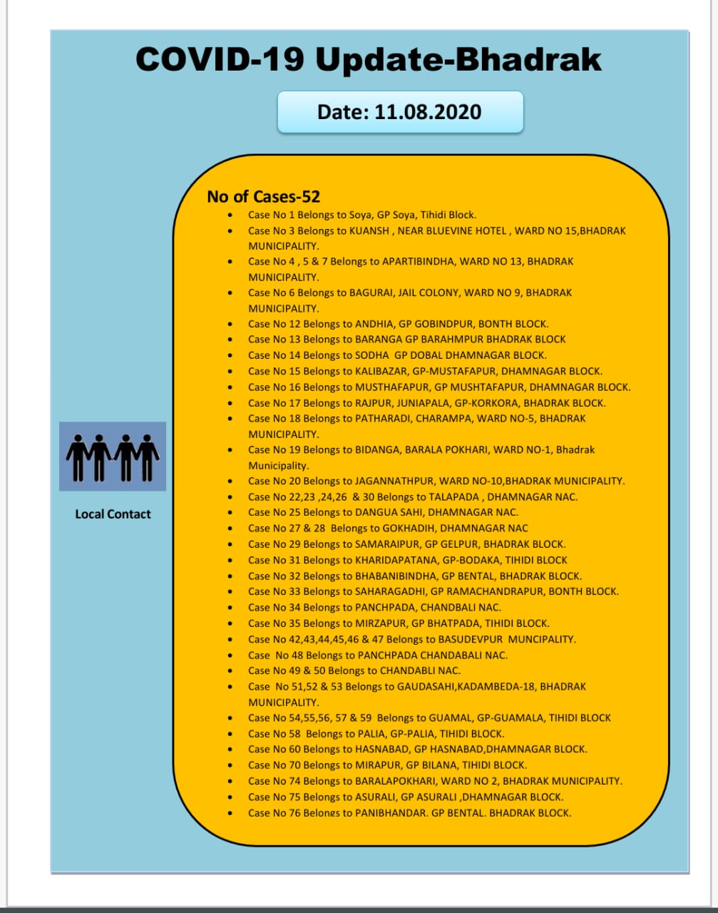 Among the local contact cases, the highest of 13 have been reported from Dhamnagar block, 12 each from Bhandaripokhari and Bhadrak municipality, 10 from Bhadrak block, nine from Tihidi, eight from Dhamnagar NAC, six from Basudevpur municipality, four from Chandbali NAC, and two from Bonth.