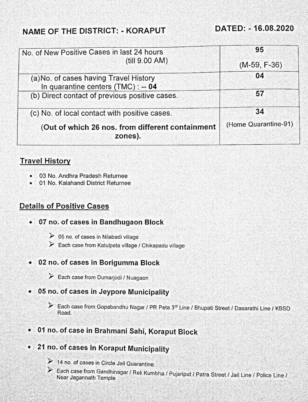According to the district administration, 34 are local contact cases while 57 are direct contacts of previous patients. Another four had travel history. Three are Andhra Pradesh returnees while one is a Kalahandi returnee.