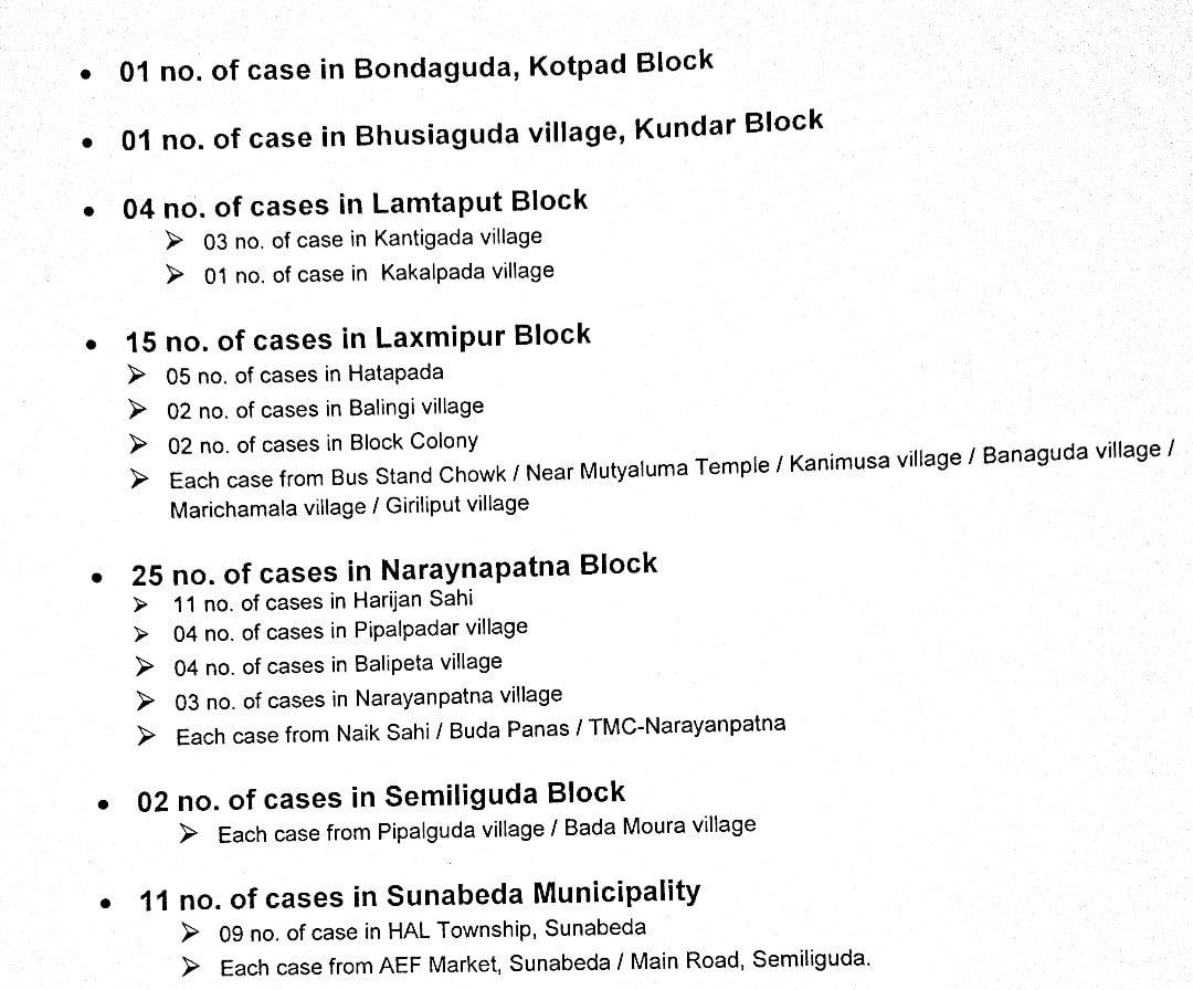 The highest of 25 have been reported from Narayanpatna block, followed by 21 from Koraput municipality, 15 from Laxmipur block, 11 from Sunabeda municipality, seven from Bandhugaon, five from Jeypore municipality, four from Lamtaput, two each from Semiliguda and Borigumma, and one each from Koraput block, Kotpad, and Kundar.