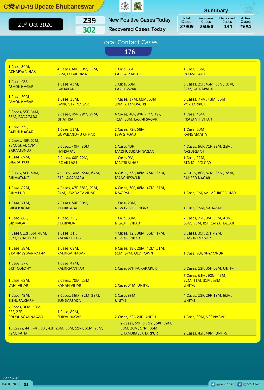 While the highest of 10 cases have been reported from Patia, 9 are from Chandrasekharpur, 7 each from Satya Nagar and Unit-6, 6 from Laxmisgar and Old Town, 5 each from Baramunda and Patrapada, 4 each from Khandagiri, Rasulgarh, Jagamara, Mancheswar, Saheed Nagar, Nayapalli, Niladri Vihar, Unit-8, Soubhagya Nagar, Dumduma, Jayadev Vihar and Bomikhal and 3 each from Pokhariput, Badagada, Ghatikia, Shastri Nagar, Unit-4 and Sundarpada.