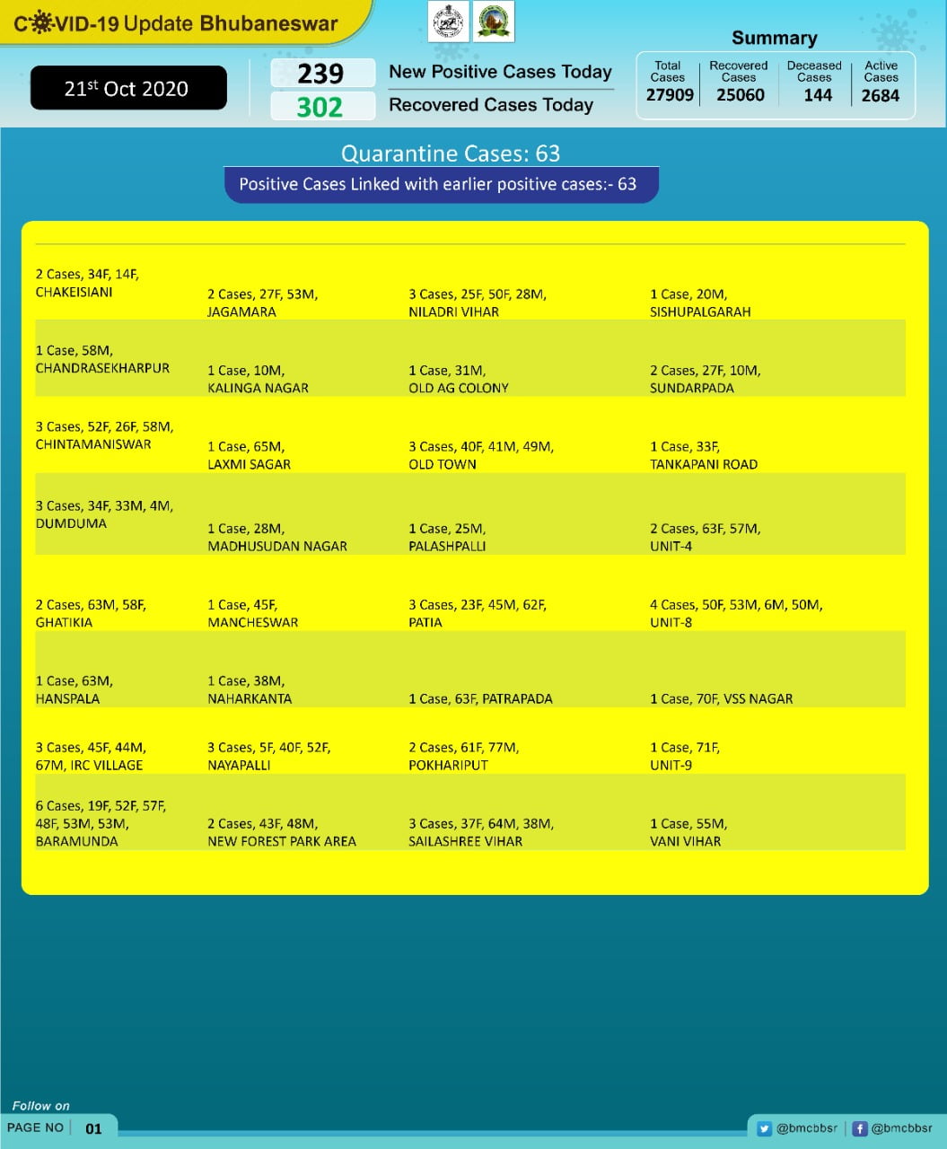 While the highest of 10 cases have been reported from Patia, 9 are from Chandrasekharpur, 7 each from Satya Nagar and Unit-6, 6 from Laxmisgar and Old Town, 5 each from Baramunda and Patrapada, 4 each from Khandagiri, Rasulgarh, Jagamara, Mancheswar, Saheed Nagar, Nayapalli, Niladri Vihar, Unit-8, Soubhagya Nagar, Dumduma, Jayadev Vihar and Bomikhal and 3 each from Pokhariput, Badagada, Ghatikia, Shastri Nagar, Unit-4 and Sundarpada.