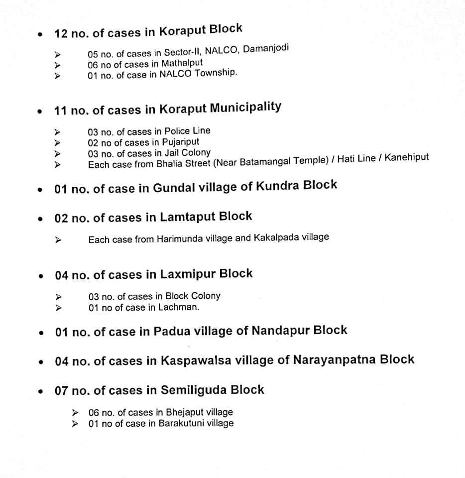 Of the new cases, the maximum of 19 was reported from Jeypore municipality, followed by Koraput block (12), Koraput municipality (11), Semiliguda (7), four each in Laxmipur block and Narayanpatna block, Dasmantpur block (3), Lamptaput block (2) and one each in Nandapur, Kundra, Bandhugaon, Borigumma and Jeypore blocks.