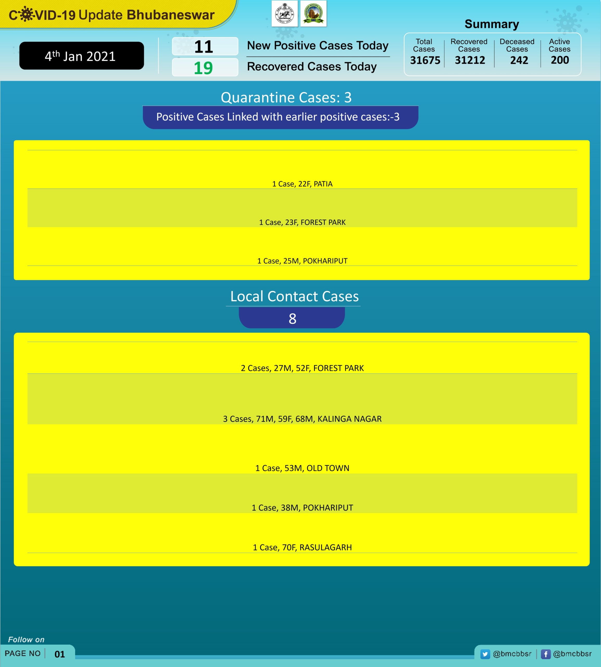 A total of 31,675 people have been infected in Bhubaneswar, of which 31,212 have recovered. There have been 242 deaths while the number of active cases is 200.