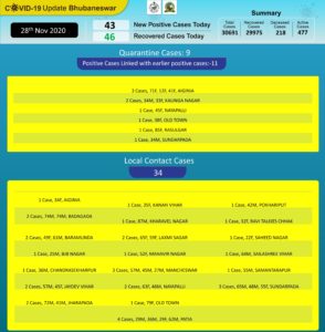 Bhubaneswar: The COVID-19 positive cases in Bhubaneswar went up to 30691 in Bhubaneswar on Saturday with overnight 43 new cases.