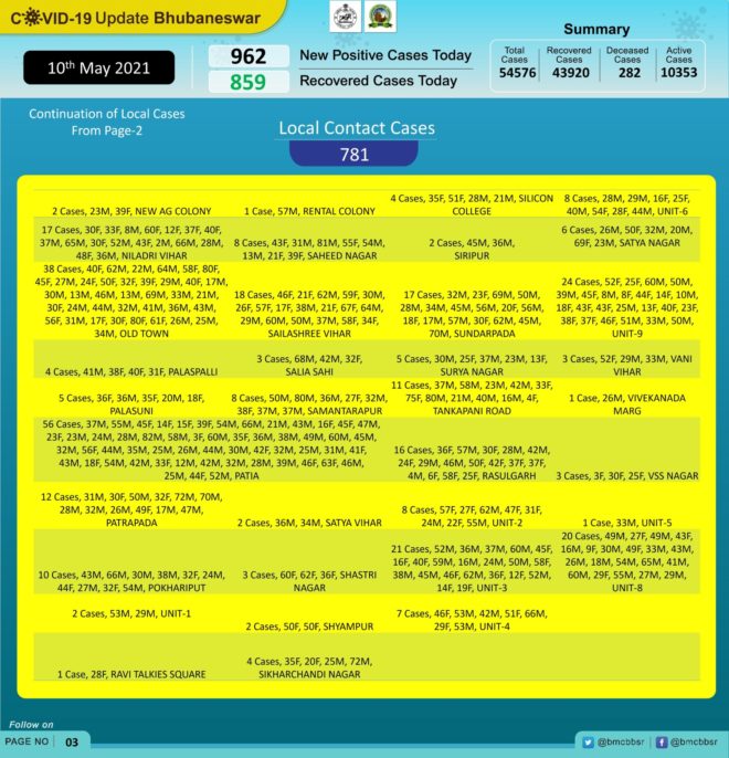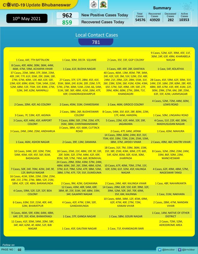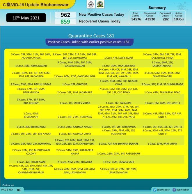 Bhubaneswar registered 962 new COVID-19 positive cases in the last 24 hours, tweeted Bhubaneswar Municipal Corporation.