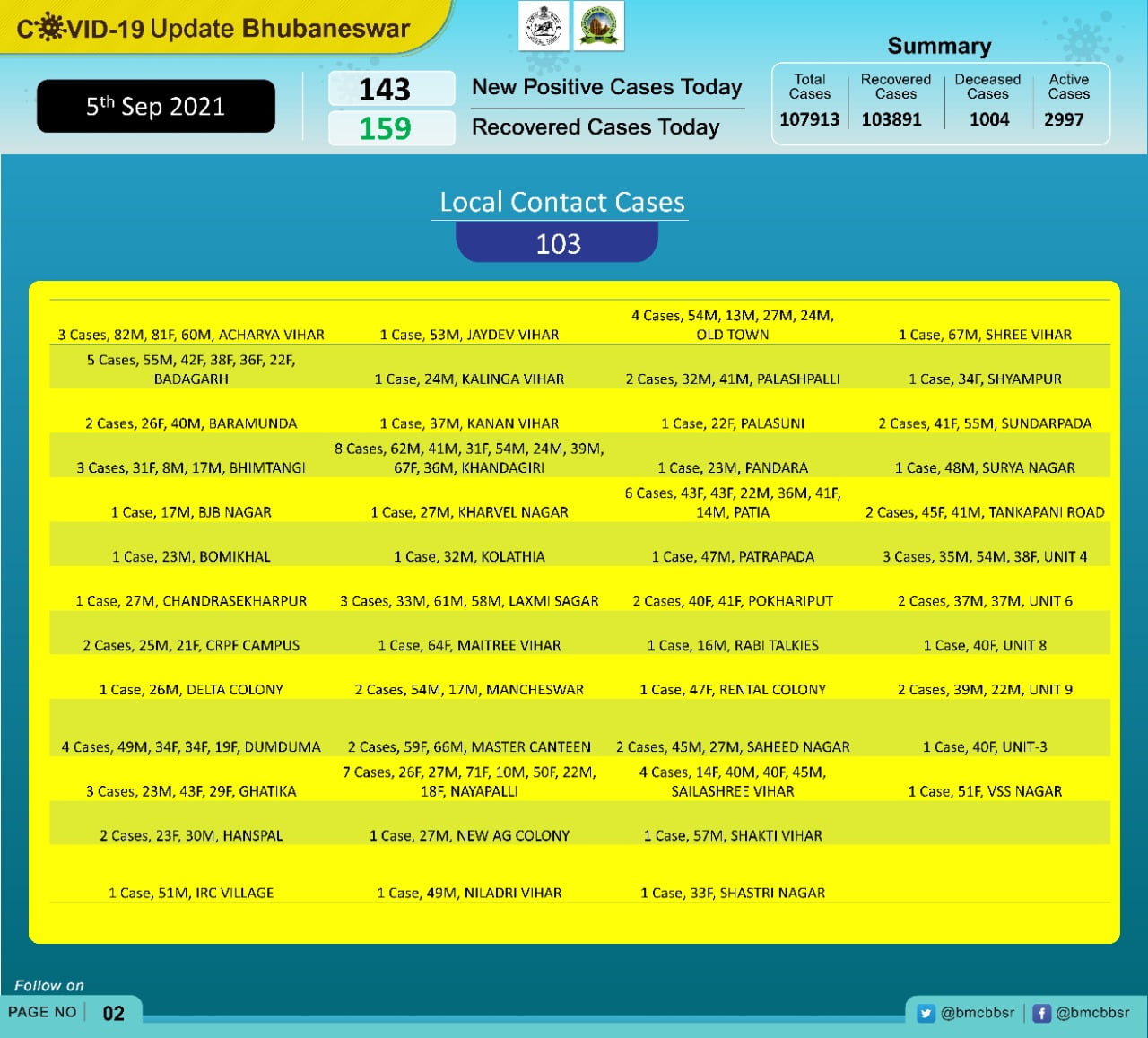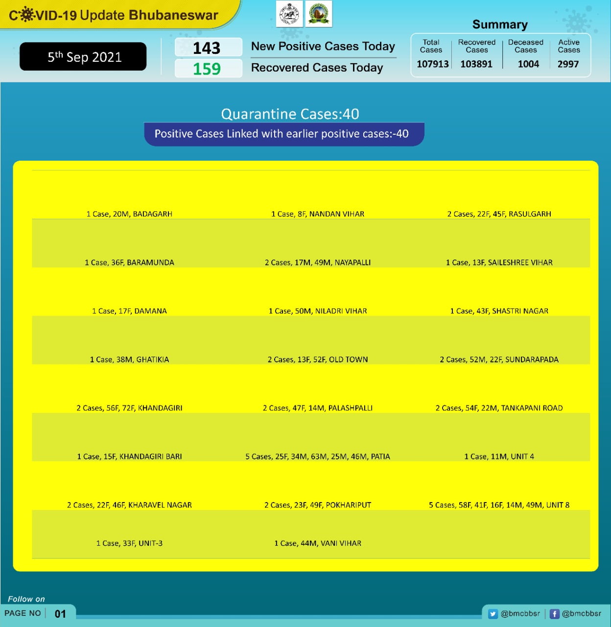 According to Bhubaneswar Municipal Corporation (BMC), 40 of the new cases are from quarantine and 103 local contacts.