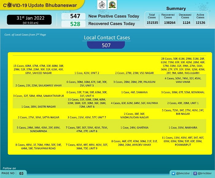Out of the total new positive cases, 40 are quarantine and 507 cases are local contact cases, stated a tweet by the Bhubaneswar Municipal Corporation.