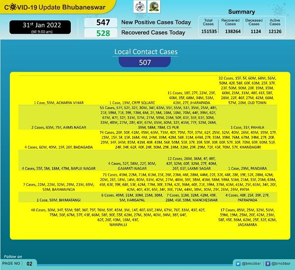 Out of the total new positive cases, 40 are quarantine and 507 cases are local contact cases, stated a tweet by the Bhubaneswar Municipal Corporation.