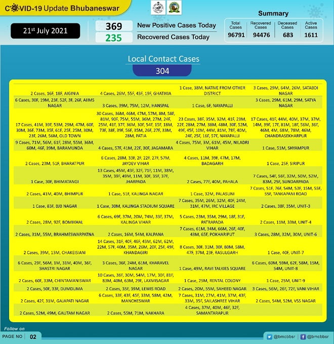 Of the new cases, 65 were from quarantine and 304 were local contacts against 282 reported yesterday, Bhubaneswar Municipal Corporation (BMC) stated in a tweet.