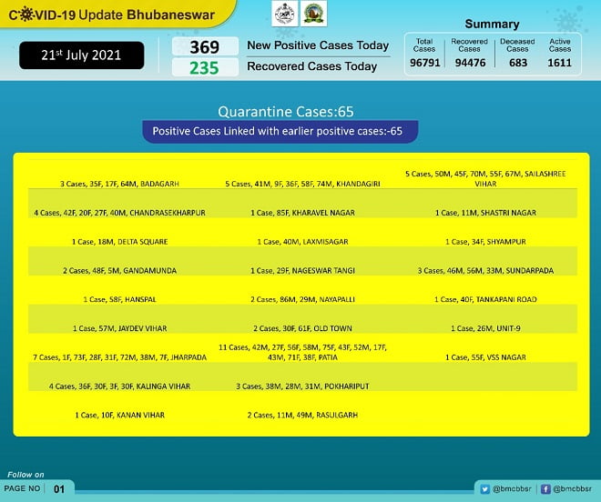 Of the new cases, 65 were from quarantine and 304 were local contacts against 282 reported yesterday, Bhubaneswar Municipal Corporation (BMC) stated in a tweet.
