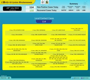 According to Bhubaneswar Municipal Corporation (BMC), total 114 new COVID cases were registered on the day against 202 of Wednesday. All the new patients are local contact cases. In a positive development, there were 150 recovered cases which outnumber the fresh cases.