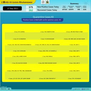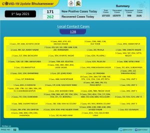 The new cases on the day included 43 from quarantine and 128 local contacts. Of the local contacts, maximum 10 cases were reported from Patia, followed by 9 each from Nayapalli and Rasulgarh and 7 each from Khandagiri and Chandrasekharpur.