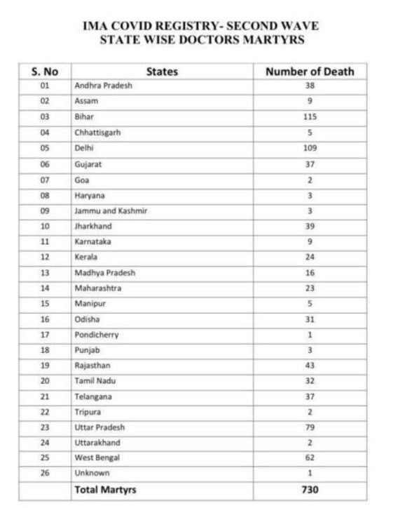 Bhubaneswar: The Indian Medical Association (IMA) on Wednesday said that 730 doctors, including 31 from Odisha, have so far died of the coronavirus infection during the second wave of the pandemic.