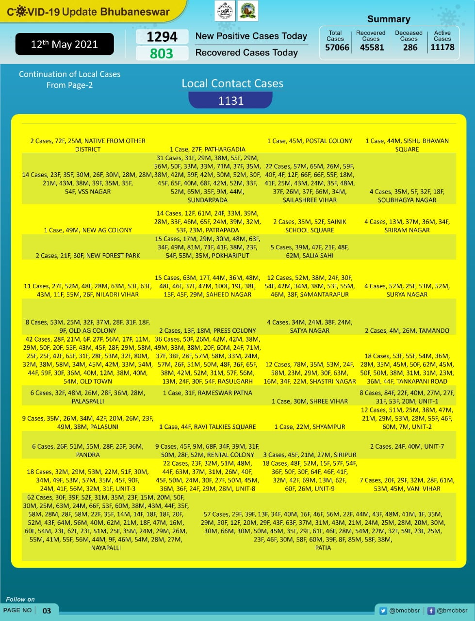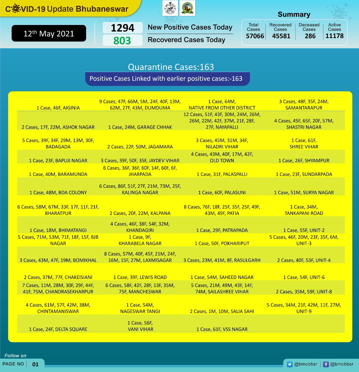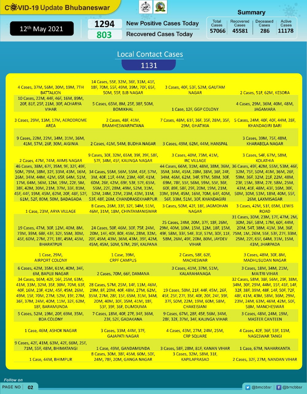 Looking at the area-wise breakup, highest number of cases are from Nayapalli (62), followed by Patia (57), Badagada (46), Khandagiri and Jagamohan Nagar (44 each), Old Town (42), Laxmi Sagar and Rasulgarh (36 each), Baramunda and Chintamaniswar (34 each), Mancheswar (32), Jharpada and Sundarpada (31 each), and Dumduma (28).