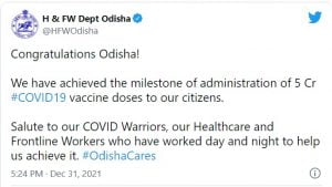 Bhubaneswar: Odisha on Friday crossed the milestone of administering 5 crore COVID vaccine doses.