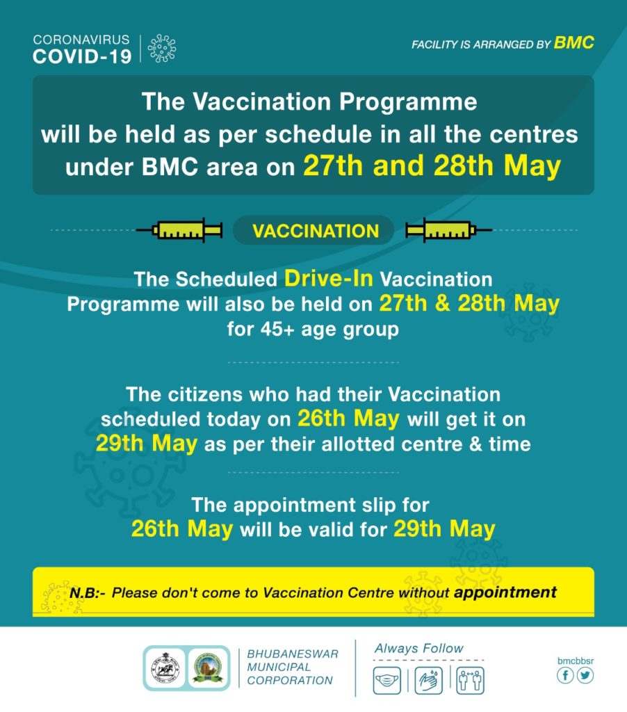 It will be held as per the schedule in all the centres under Bhubaneswar Municipal Corporation (BMC) area on Thursday and Friday. The scheduled drive-in vaccination programme will also be held on Thursday and Friday for 45 years and above age group.