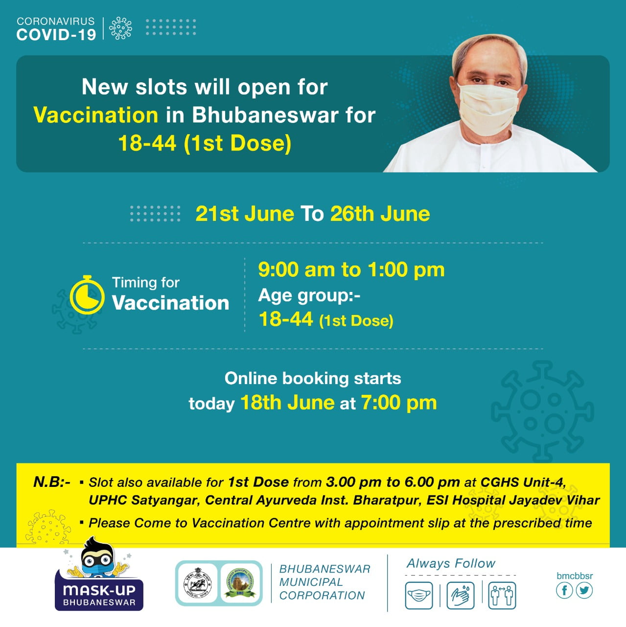 Bhubaneswar: The Bhubaneswar Municipal Corporation (BMC) has announced new slots for COVID-19 vaccination for 18-44 age group (1st dose) in Odisha capital.