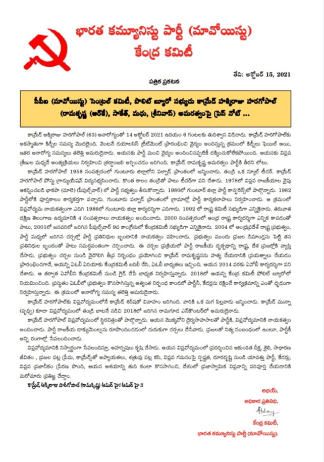 Bhubaneswar: After much speculation, the CPI (Maoist) on Friday confirmed the death of its leader Akkiraju Haragopal alias Ramakrishna (RK).