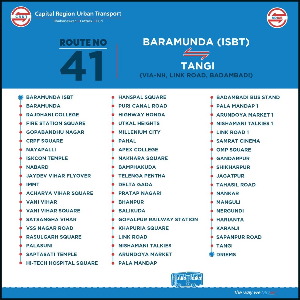 The buses on route No 41 will run from Baramunda Inter-State Bus Terminus (ISBT) to Tangi in Cuttack district. It will go through Link Road and Badambadi in Cuttack.