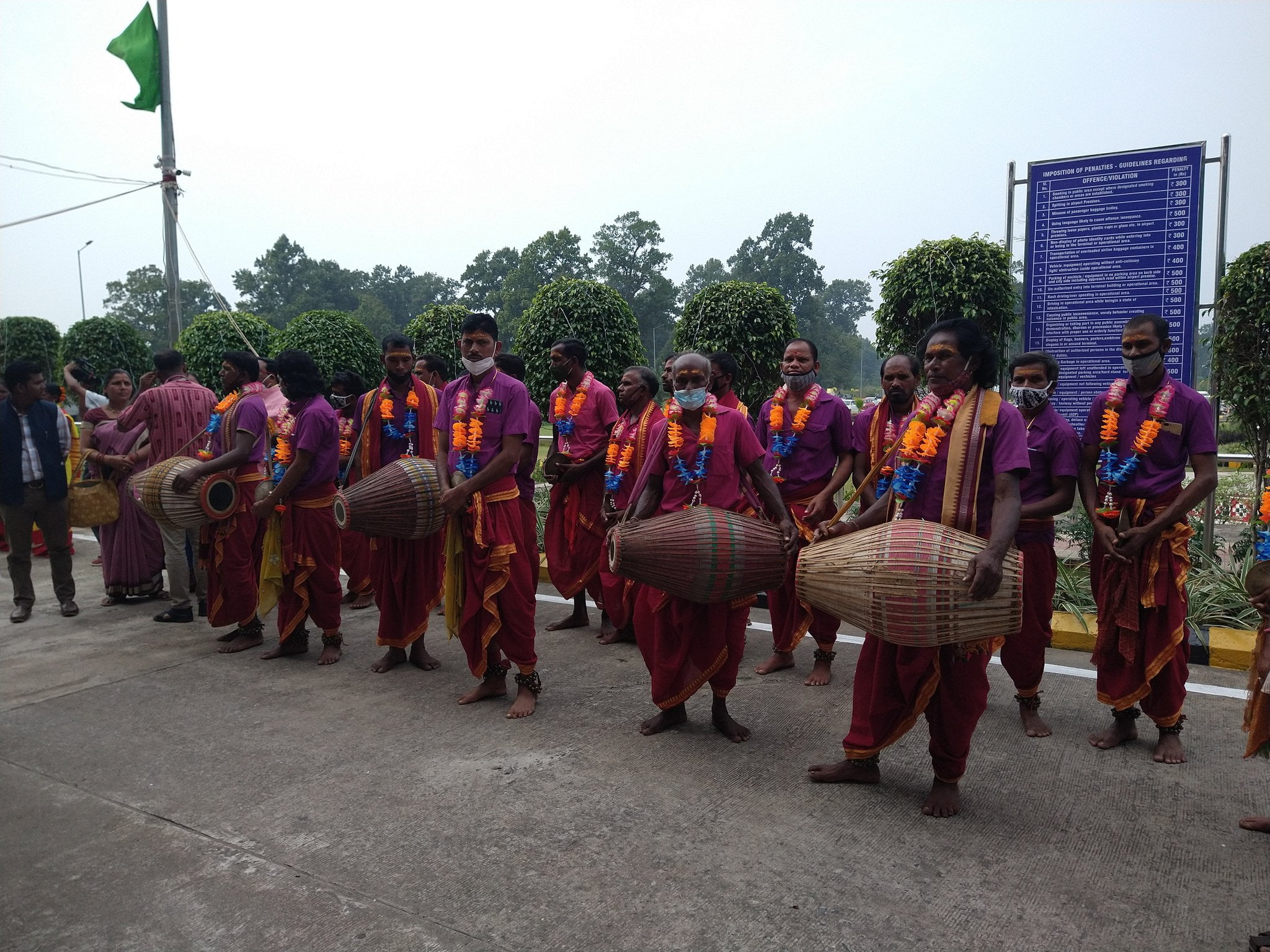 Jharsuguda: Cultural groups with their traditional attires and instruments prepare to perform during Udan Utsav celebration at Veer Surendra Sai (VSS) Airport in Jharsuguda on Monday.
