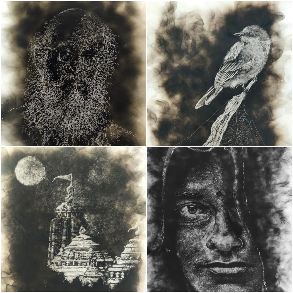 Deepak Biswal uses the ash of Dibiri (kerosene lamp) for his art. He calls this the smoke art form.