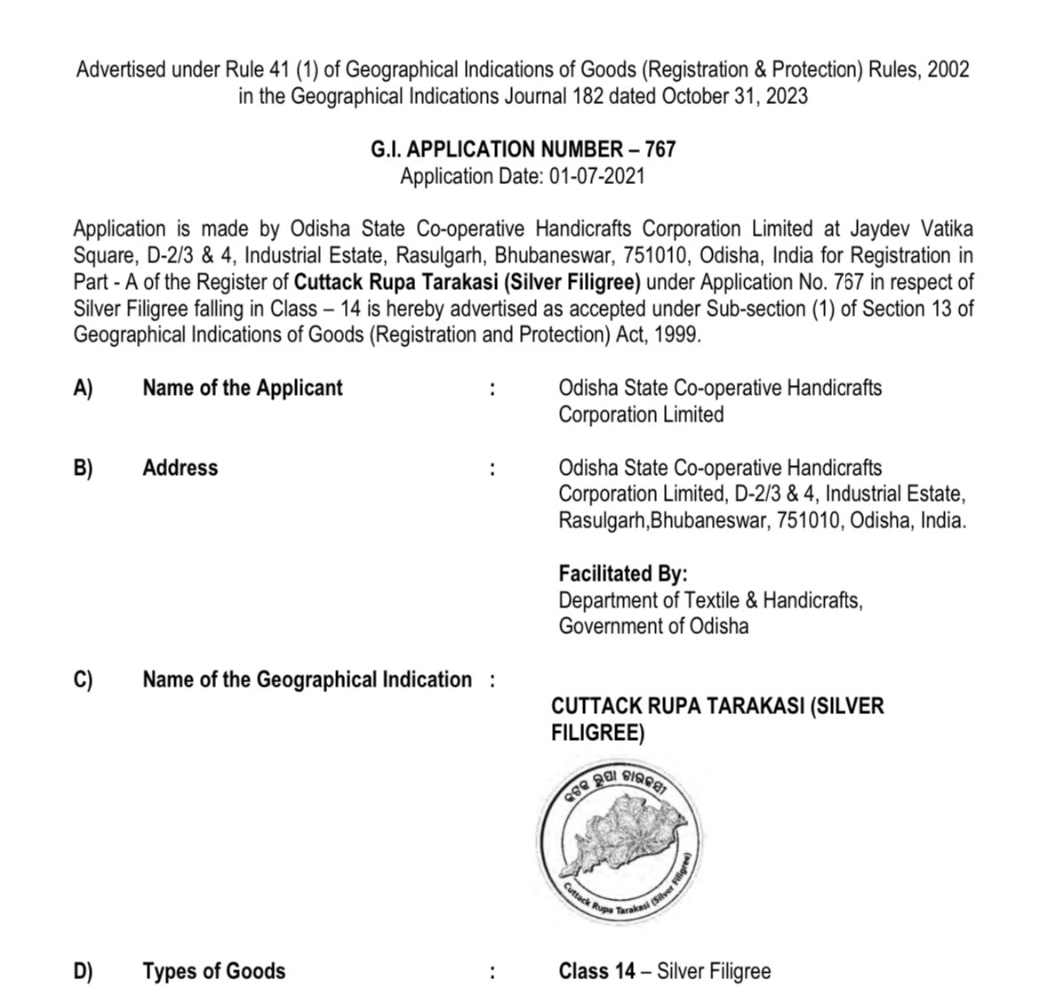 The Odisha State Cooperative Handicrafts Corporation Ltd (UTKALIKA) has filed the application, seeking GI tag for the famed silver filigree of Cuttack, on July 1, 2021. The applicants had traced its origins to 13th century to show historical linkage of the art to the region.