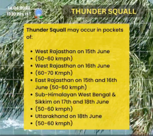 “Cyclone Warning for Saurashtra & Kutch Coasts: RED MESSAGE. VSCS BIPARJOY at 8.30 today over NE Arabian Sea, about 280km WSW of Jakhau Port (Gujarat) and 290km WSW of Devbhumi Dwarka. To cross near Jakhau Port by evening of June 15 as very severe cyclonic storm with maximum sustained wind speed of 125-135 kmph gusting to 150 kmph.”