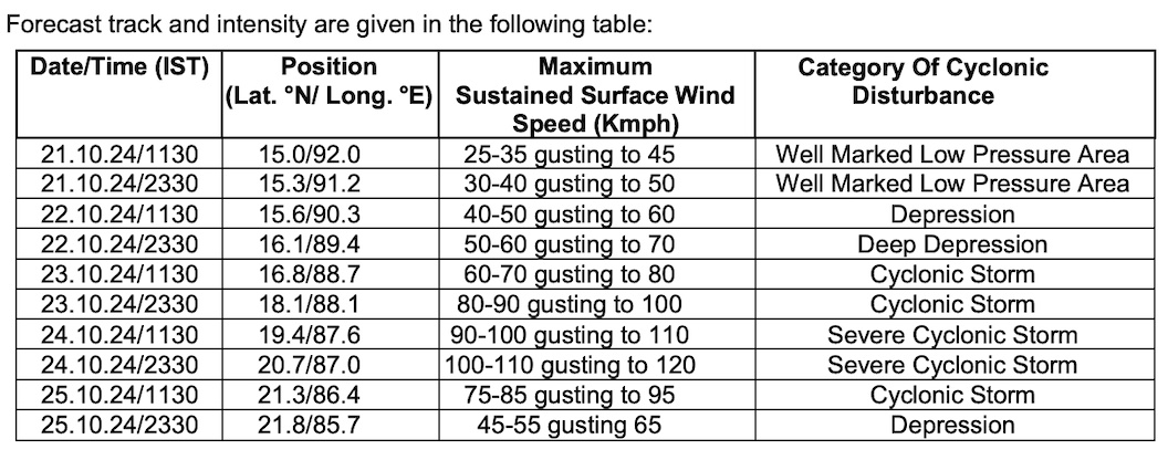 “The well-marked low-pressure area over Eastcentral Bay of Bengal is expected to move west-northwestwards and intensify into a depression by October 22 morning and into a cyclonic storm by October 23 over the same region.”