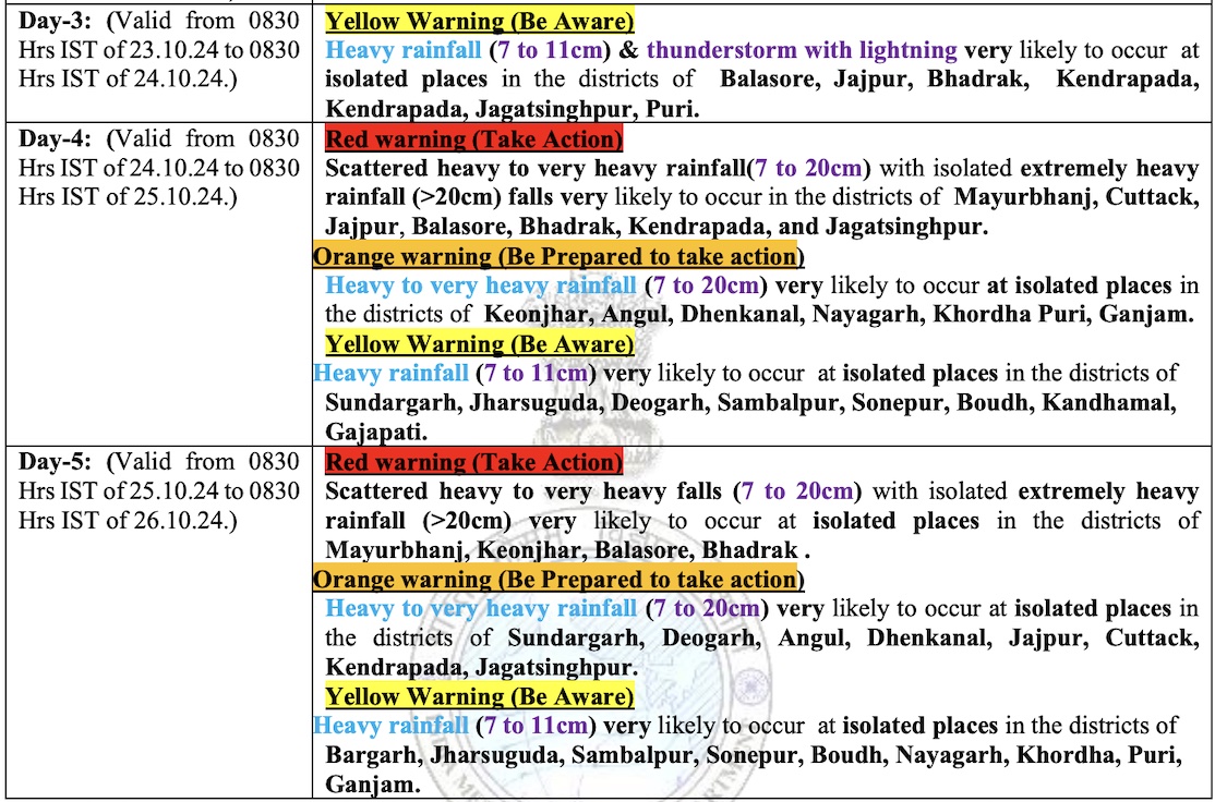On October 24-25, heavy to very heavy rainfall is likely at a few places and extremely heavy rainfall (≥ 21 cm) at isolated places in Balasore, Mayurbhanj, Bhadrak, Kendrapada, Jagatsingpur Keonjhar, Jajpur, Cuttack and Dhenkanal and Puri districts.