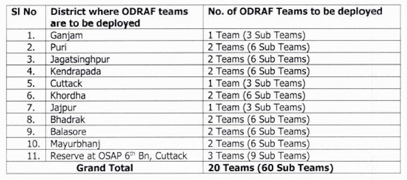 Bhubaneswar: The Odisha government has dispatched 20 ODRAF teams to districts, which are likely to be impacted by the possible Cyclone ‘Dana’.