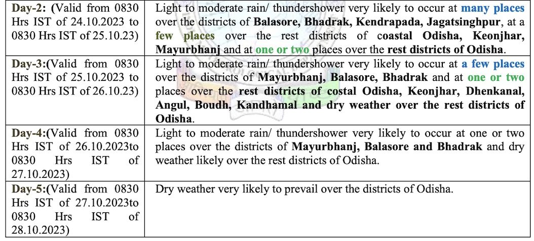 Under its influence, squally wind speed reaching 40-50 kmph gusting to 60 kmph is likely from October 23 evening to 24 along and off Odisha coast and it is likely to increase gradually becoming gale with wind speed of 50-60 kmph gusting to 70 kmph from October 24-26.