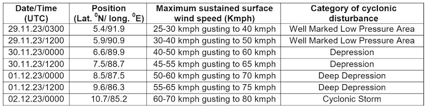 Considering all the weather models, the IMD concluded that the well marked low-pressure area over southeast Bay of Bengal and adjoining Andaman sea is likely to move westnorthwestwards and intensify into a depression over southeast Bay of Bengal on November 30. Thereafter, it is likely to move northwestwards and intensify gradually into a cyclonic storm.