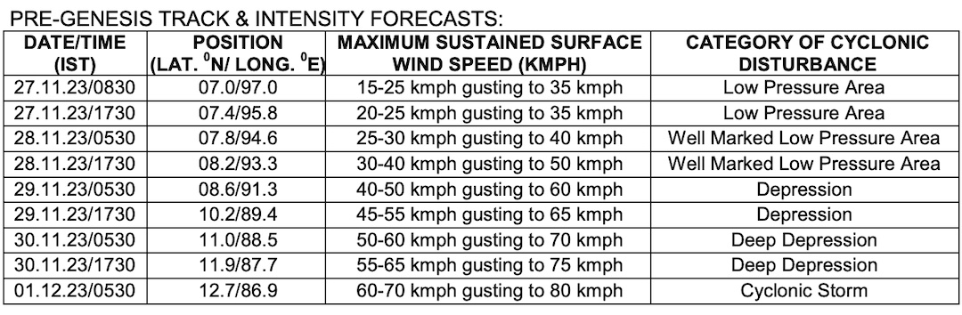 IMD Multi Model Ensemble (MME) is indicating formation of depression around November 29 with initial west-northwestwards movement till November 30. Thereafter, the system is indicated to recurve gradually north-northeastwards. Peak intensification up to severe cyclonic storm stage is indicated.