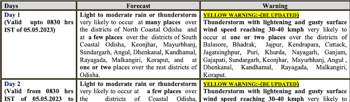 While the India Meteorological Department (IMD) has issued yellow warning for thunderstorm with lightning and gusty surface wind speed reaching 30-40 kmph for two days, the day temperature in the state may touch 40 degree Celsius by May 7.