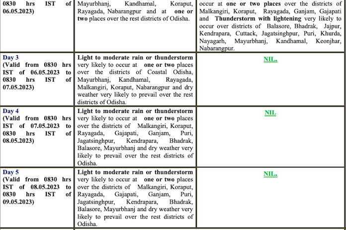 The IMD further informed that a cyclonic circulation is likely to develop over Southeast Bay of Bengal around May 6. Under its influence a low pressure area is likely to form over the same region around May 7. It is likely to concentrate into a depression over Southeast Bay of Bengal on May 9. Thereafter, it is likely to intensify into a cyclonic storm while moving nearly northwards towards central Bay of Bengal. The details of its path and intensification will be provided after the formation of low pressure area, it added.